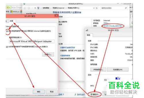 4. 然后在我们正常连接的网络处,点击进入属性窗口下,切换到“共享”,将“允许其他网络用户通过此计算机的Internet连接来连接”选项勾选上。然后在家庭网络连接处,设置为虚拟wifi“Microsoft Virtual WIFI Miniport Adapter ”,最后点击“确定”。