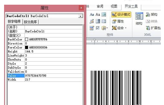 下一步就是修改,条形码的内容了,右击条形码---属性---在弹出VBA属性框中,进行设置“VALUE“设置成:你需要的条码,比如:9787536470798,并点击回车键。如果在修改条码的时候看不到或是修改不了,就需要修改下面的长度,在回车。