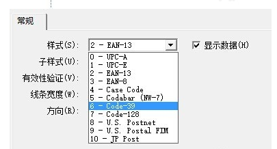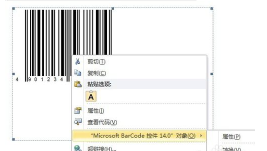 - 4右击刚才插入的条形码,选择该控件---属性---在弹出的属性对话框中---根据自己需要选择条形码的不同类型(样式),和显示的不同方向。