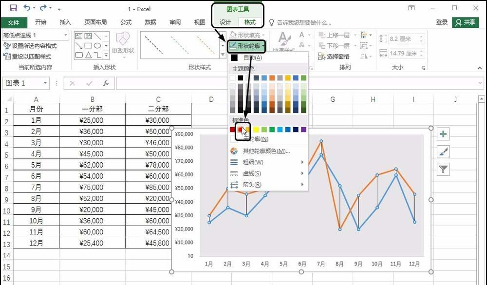 3、设置线条颜色 选中图表,单击“图表工具-格式”选项卡,单击“形状轮廓”按钮,在展开的列表中单击要设置的颜色,如红色,如下图所示。