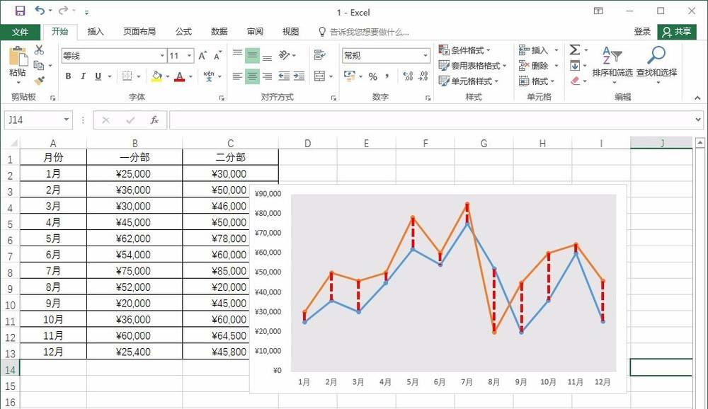 6、展示最终效果 随后即可看到添加高低点连线并设置线条样式后的效果,用户通过该线条,可更加方便对比两个折线图中的销售额情况了,如下图所示。