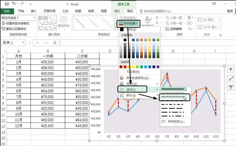 5、设置线条样式 单击“图表工具-格式”选项卡,单击“形状轮廓”按钮,在展开的列表中单击“虚线”,在级联列表中单击要应用的虚线样式,如下图所示。