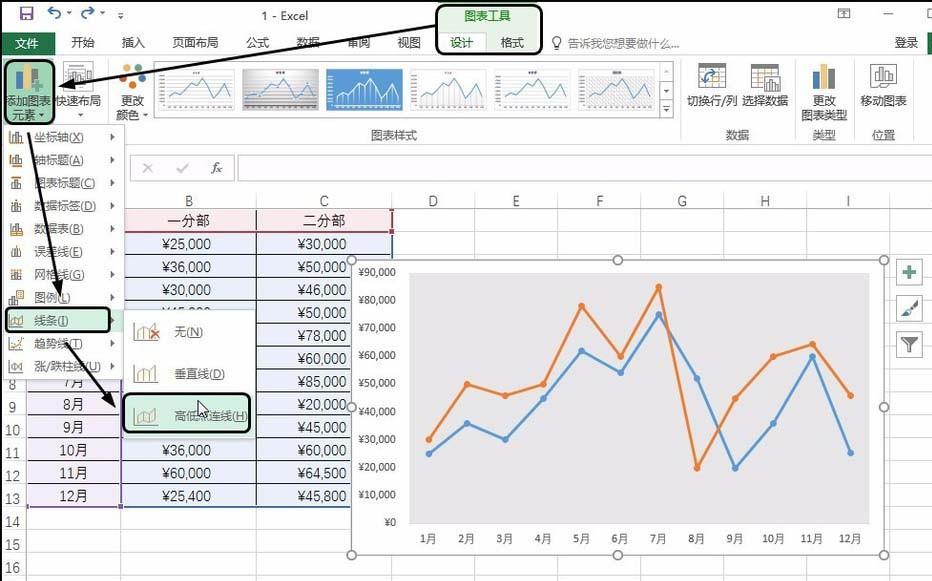 Excel2016折线图可以是哟欧诺个高低点连线功能。在高低点之间添加线条,下面我们就来看看详细的设置方法。 1、添加高低点连线 选中图表,单击“图表工具-设计”选项卡,单击“添加图表元素”按钮,在展开的列表中单击“线条”,在级联列表中单击“高低点连线”选项,如下图所示。