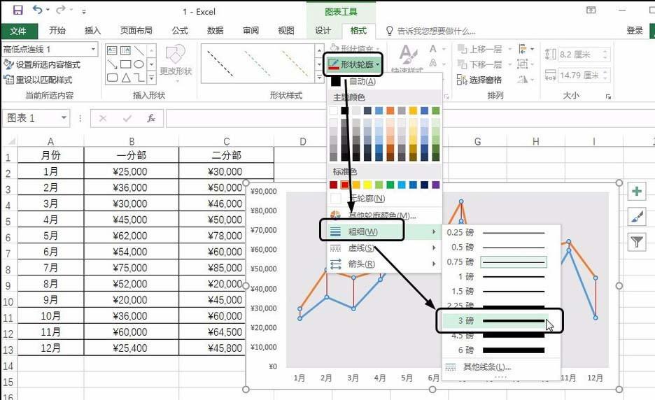 4、设置线条粗细 单击“图表工具-格式”选项卡,单击“形状轮廓”按钮,在展开的列表中单击“粗细”,在级联列表中单击磅数,如“3磅”,如下图所示。