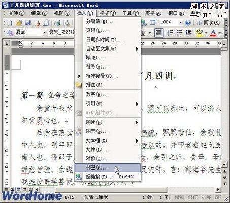 在Word2003文档中,对于不再使用的书签用户可以根据需要将其删除,操作步骤如下所述: 第1步,打开Word2003文档窗口,依次单击“插入”→“书签”菜单命令,如图2012040604所示。