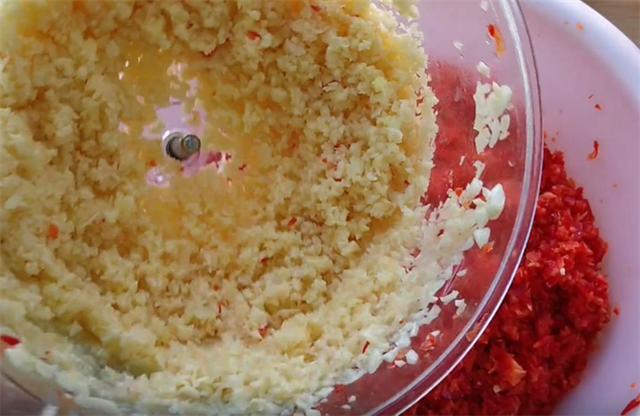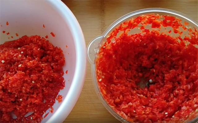4.随后我们把辣椒切成小段,放入绞馅机中搅碎,尽量不要搅的太碎,有一些颗粒状,这样口感会更好,没有绞馅机,用刀切也是一样的,我们把绞碎的辣椒放入一个较大的盆中。