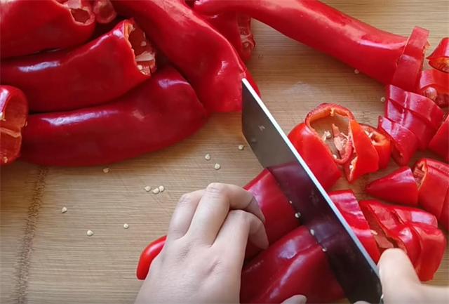 1.今天和大家分享一个东北辣椒沫的做法,我们这儿每到秋季家家户户都会做一些,特别的开胃下饭。首先准备红尖椒五斤,洗净晾干水分,这种红尖椒富含维C胡萝卜素,要比青尖椒更加的有营养,而且口感微甜。