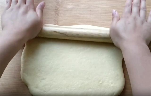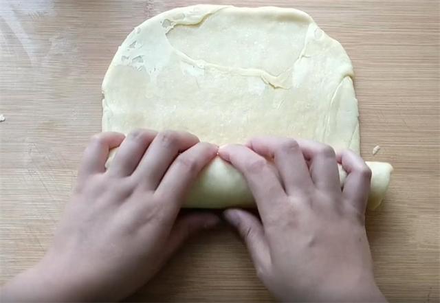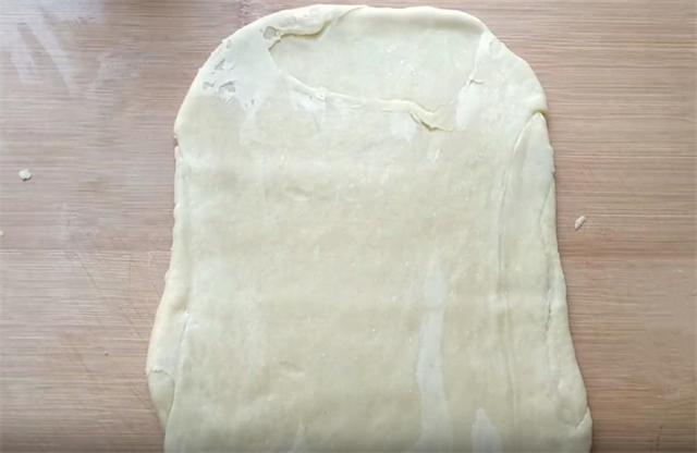 6.然后我们用擀面杖把它擀成长方形的大薄片,注意边缘一定不要用力擀,这样容易把油酥挤出来。