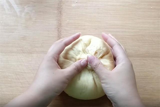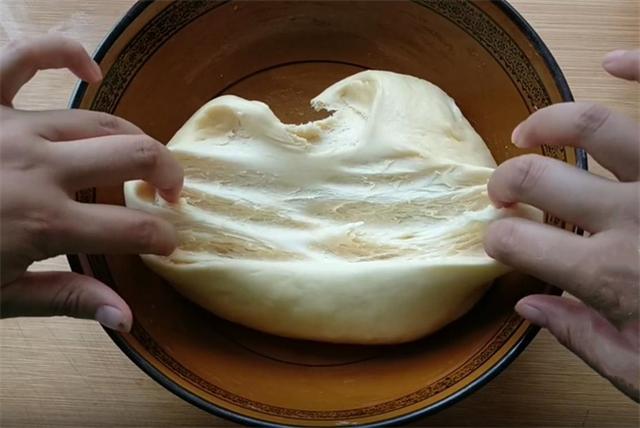 3.半个小时以后,大家可以看到这个面团是微微发酵的,但是它的延展性已经非常好了。