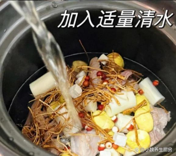 5:准备好煲汤的器皿,倒入鸽子肉和排骨,放入一些山药块,五指毛桃,芡实和茯苓,放入一些板栗,加上足量的纯净水,盖上汤锅炖煮,调到大火炖煮。