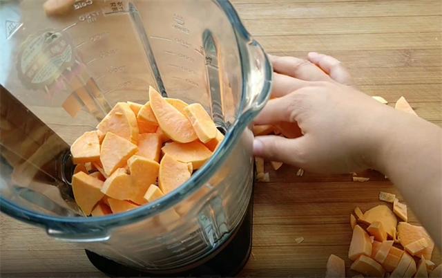 1.今天和大家分享一个红薯糯米饼的做法,它的特点就是香甜软糯,做法非常简单。首先我们准备一个红薯约300克,红薯去皮切成小块,放入料理机中,然后加入三克酵母,直接加入酵母能够使酵母更快的溶解,加入五克白糖促进发酵,白糖不需要放的太多,本身红薯就是甜的。