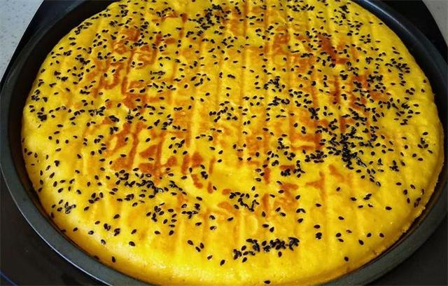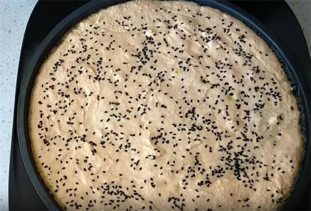 4.起锅开小火,油温微热倒入面糊,用铲子把面糊摊平,我们撒上一些黑芝麻作为点缀,在上面淋上一层油,防止烙糊和粘连。