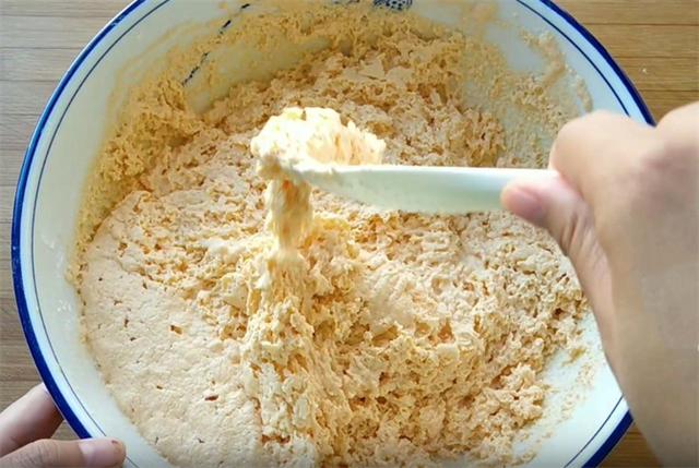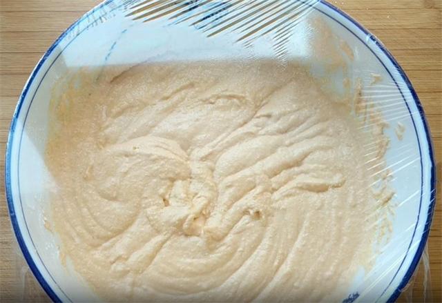 2.把打成泥的红薯倒入碗中,分次加入约200克的糯米粉,再加入适量清水,边倒边搅拌,为了更好消化,我们可以加入80克左右的细玉米面,也是边倒边搅拌,调成这种粘稠程度即可,盖上保鲜膜醒发至两倍大,也可以晚上做好放冰箱冷藏发酵。