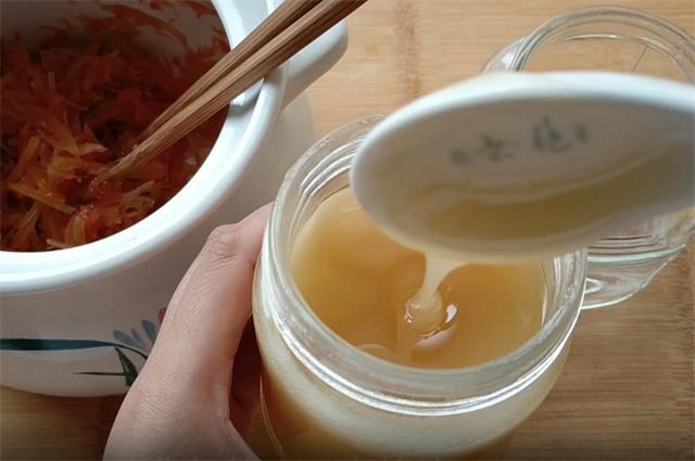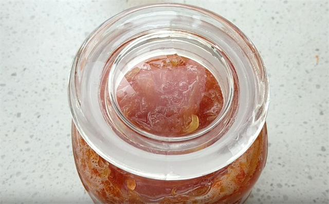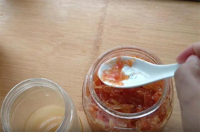 9.接下来我们准备一个无水无油的玻璃的密封罐,晾至果肉温热,在密封罐的底部铺一层果肉,再浇上几勺蜂蜜,然后再铺上果肉,这样交叉着与蜂蜜放入密封罐中。