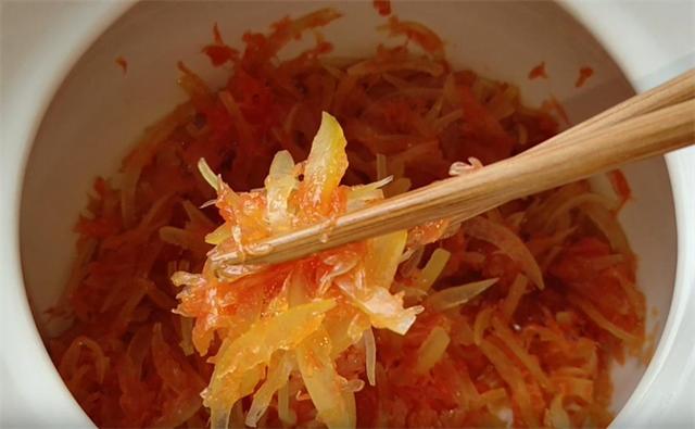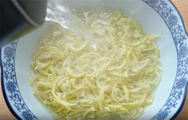 5.随后,将柚子皮丝放入碗中,加入适量食用盐,用手抓捏,这一步是去除柚子皮的苦味,抓至变软,我们倒入没过柚子皮的开水浸泡20分钟,再次去除苦味,也可以用锅煮一下。