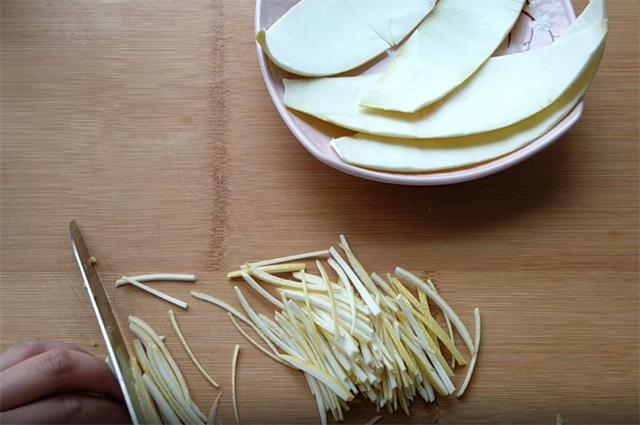 4.然后将处理好的柚子皮摞在一起,用刀切成细丝,这个长短依据个人的喜好决定,柚子皮的主要作用就是止咳化痰。