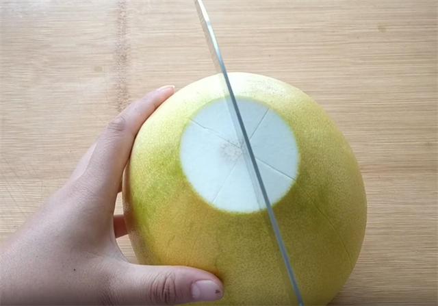 2.然后像这样在柚子皮的表面划上十字花刀,把柚子皮剥下来,果肉先放一旁备用。