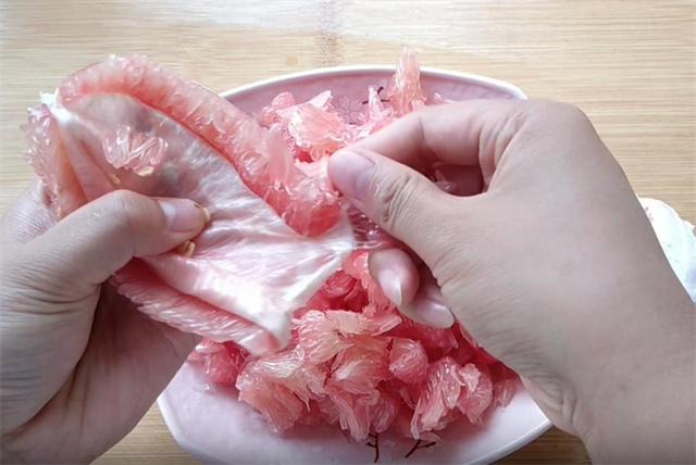6.接下来我们来处理果肉,将柚子果肉掰成小块,背部划开,这样更容易分离出果肉,把籽和皮去干净,防止影响口感。