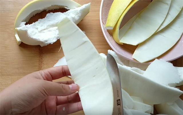 3.接着,我们要耐心地将柚子皮上的白色瓤层尽量刮除干净,这一步至关重要,因为白色部分苦味较重,刮得越薄,成品味道越佳。