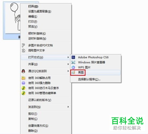 今天小编介绍的是,我们如何在Windows系统中,使用系统自带的画图工具给图片局部填色。 方法一(此方法只使用适用于分界线明确的图画) 1. 打开电脑,选择一张需要填充颜色的图片,选定点击鼠标右键,在弹出窗口选择【打开方式】,然后选择【画图】(即电脑自带画图工具)