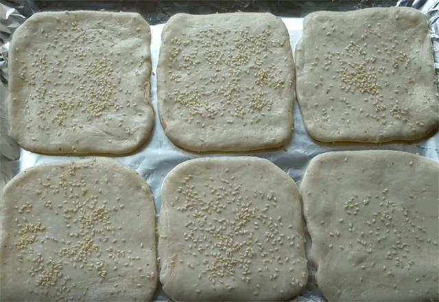 6.做好的生坯放入烤盘,表皮刷少许的清水,这样能够使芝麻粘得更加牢靠,水一定不要刷多,这样会影响发酵,放入烤箱二次发酵25分钟左右,也可以盖上保鲜膜处于室温发酵,发酵至饼明显鼓起即可。