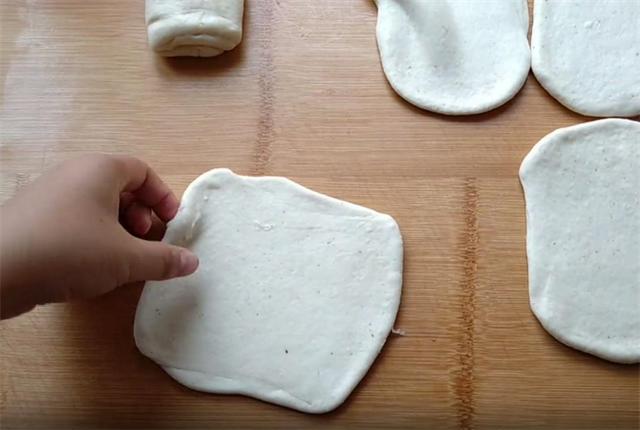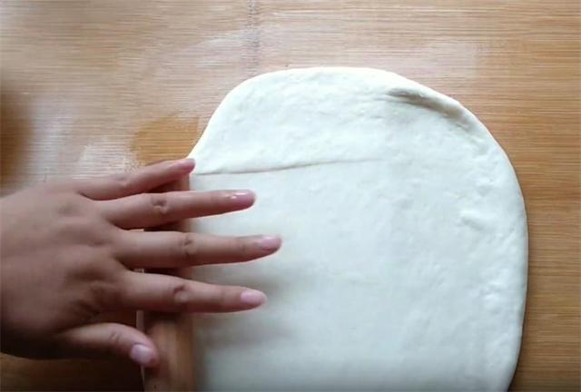 3.下面我们把微微发酵的面团放在案板上揉搓排气,多揉一会儿,在案板上抹少许的油,把面团用手按扁,然后用擀面杖把它擀成大薄片,厚度约为半厘米左右。