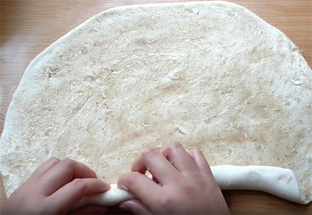 4.然后均匀的涂抹上油酥,这个油酥一定不要太稀,如果过稀的话,一会儿我们开酥油将会全被挤出来,涂抹均匀之后,我们从下向上把面皮卷起,稍微整理一下,下六个面剂。