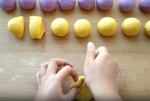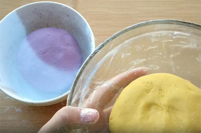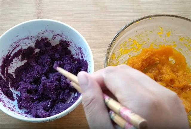 1.今天和大家分享一个花式馒头的做法,主角是营养丰富的紫薯与甜蜜的南瓜,我们用紫薯和南瓜和面,这样做好吃又好看。首先,让我们将紫薯与南瓜精心洗净去皮,切成薄片,装入碗中,每碗约150克,上蒸锅蒸熟,或者是用微波炉,记得盖上保鲜膜,微波约四分钟,蒸熟后各加入15克白糖,按压成细腻的泥,晾至温热,各加入两克酵母轻轻拌匀,切记避免高温扼杀酵母菌的活力,这样面就发不起来了,紫薯含水量比较低,如果干的话,可以加少许的清水。