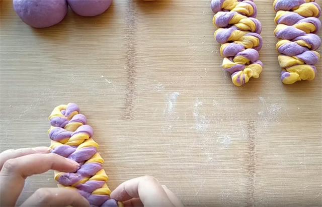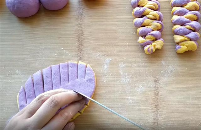 5.接下来在案板上轻轻撒上一层干面粉,取一个黄色面团和一个紫色面团,分别按扁并擀成椭圆形的薄片,然后摞在一起轻轻按压在边缘,对应着切成宽条。
