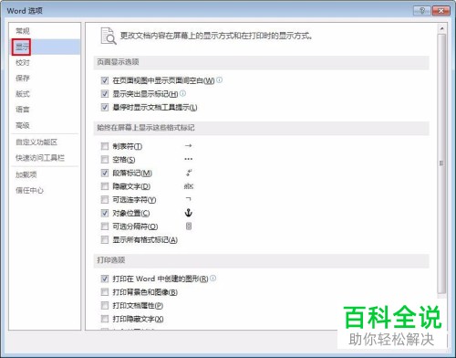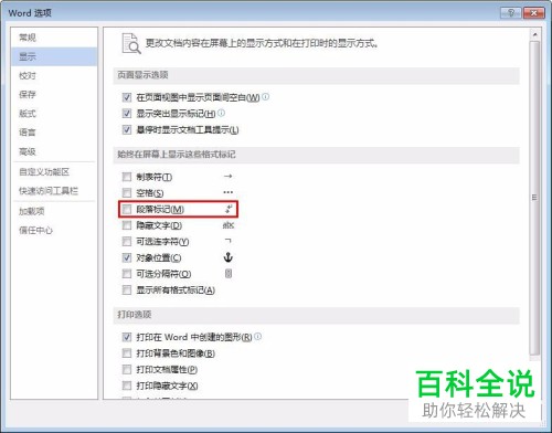 5. 第五步根据下图所示,先点击左侧【显示】,接着取消勾选【段落标记】,然后点击【确定】选项。