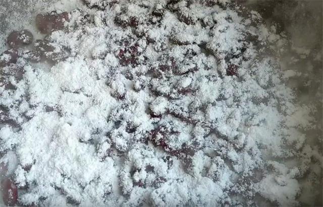 7.全程开大火,蒸汽上来的时候,我们开始均匀的慢慢撒糯米粉,撒过糯米粉的地方,每次撒粉后需待蒸汽重新升起再继续,不要着急,这样防止蒸出的切糕夹生,直至形成约1.5至2厘米厚的糯米层,再覆盖一层豆子,水汽上来以后再次撒糯米粉,均匀的慢慢的撒。