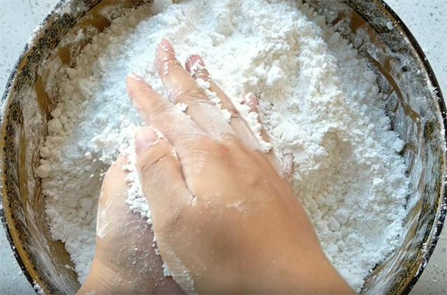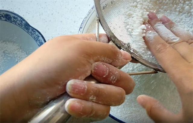4.然后用密眼漏勺过滤出大的颗粒,确保粉质细腻,粉末越细腻,我们蒸制的时候切糕才能不出现夹生的情况,我们把过滤后的大颗粒用手把它再次搓开,这是保证切糕口感筋道细腻的关键,然后再用漏勺过滤,粉末越细腻,蒸出来的切糕口感也越筋道越细腻。