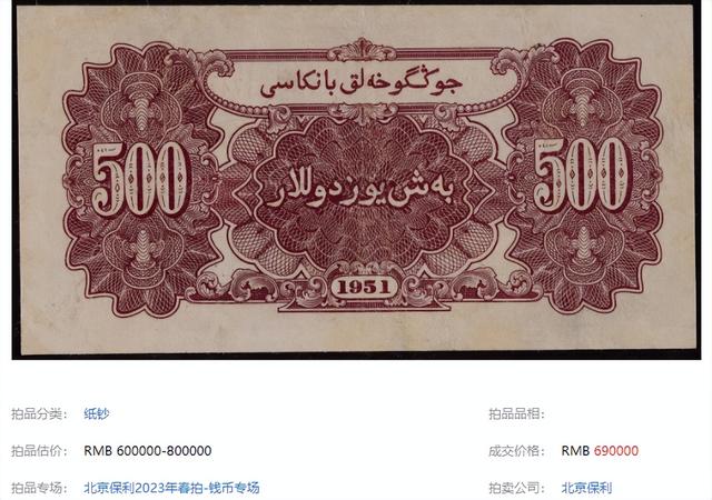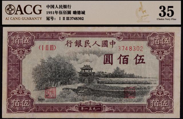 本次拍卖会的纸币中,成交价排行第三的,就是一张天王纸币,它是500元瞻德城纸币。 这张纸币的币面主图案就是位于新疆的历史古迹瞻德城。 它属于第一套人民币。 一版币一共有62种不同的版别,部分纸币也会按地区投放,比如500元瞻德城,就只在新疆地区发行。这导致绝大部分地区,都没有可能找到这种珍贵的纸币。 此外,这张500元在51年发行,仅流通使用了3年多时间就停用了。所以留到现在的数量极为稀少。