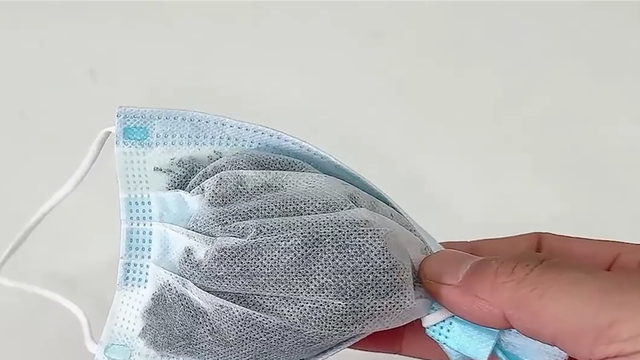 首先,我们将一次性口罩的一端剪开,使其变成一个开口的小袋子。由于口罩共有三层,剪开后里面会有两个独立的小袋子,我们可以利用这两个小袋子来制作两个除味口袋。接下来,我们要在口罩内加入一些具有吸附异味能力的物品。