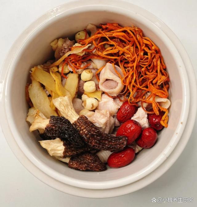 进入7月中旬之后,我们迎来了炎热的三伏天,被很多南方人称为最难受的40天,俗话有“冷在三九,热在三伏”,都是非常痛苦的时候,但是冷天还能接受,但是炎热的三伏天让人绝望,基本上每天都接近40摄氏度,简直像住在“火炉”中,出汗会增多,在外面吃饭等餐累,在家做饭也累,幸好厨房制冷设备。今天准备在家做饭,下班后购买一大堆食材,准备用老母鸡,羊肚菌和虫草花制作一款靓汤,广东人天天喝,对身体特别有益处,赶快学起来吧。三伏天,宁可少吃肉,也要多喝这汤,滋补气血,增强免疫少生病。  【羊肚菌虫草花红枣炖老母鸡汤的具体做法】 挑选一些食材:选购干莲子15克,玉竹20克左右,虫草花25克,羊肚菌几个(羊肚菌是一种珍稀的菌类,个头尖尖的,含有一种独特的香味,羊肚菌可以用来煲汤,具有强身健体的作用),老母鸡半只(老母鸡是养殖很长时间的鸡,鸡肉会非常鲜嫩,鸡油非常多,煲出来的汤品鲜美),纯净水若干,5-6个大红枣,姜片少许,大葱半根,适量料酒,一丢丢胡椒粉,食盐若干,其他。 具体制作过程:1:提前挑选好新鲜老母鸡,羊肚菌,红枣,虫草花和其他食材,先把虫草花用清水冲洗,然后用温水泡发15分钟,最后控干表面的水分。2:提前把干莲子泡发好,加上半勺食用碱,把莲子提前泡发开,用工具挑出莲子心,红枣全部去核,洗净备用。 3:把羊肚菌去掉根部,放在容器里,加上适量温水泡发,去掉里面的泥沙,生姜切成一些片状,大葱切成小段,备用。4:把老母鸡提前处理干净(记得要去掉鸡毛和内脏,一定要处理干净,也可以用鸭肉替代,都可以用来煲汤)5:剁成若干块状,用盐水或料酒浸泡,清洗掉里面的血水,准备好其他几种食材,开始烹饪这道羊肚菌虫草花红枣炖老母鸡汤。