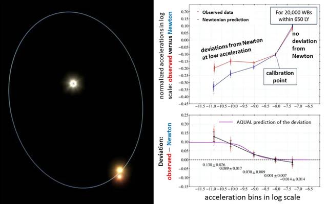 在《天体物理学》杂志的一篇论文中,作者发现了一个令人惊讶的结果:当引力加速度非常非常小的时候,牛顿和爱因斯坦的理论都会崩溃!他们用欧洲空间局的盖亚望远镜观测了大量的宽双星系统,也就是两颗相距很远、绕着彼此缓慢旋转的恒星。他们发现,在这些系统中,恒星之间的引力加速度比地球表面的重力加速度还要小几个数量级!在这样低的加速度下,恒星之间的相对速度竟然比牛顿和爱因斯坦预测的要大出30%到40%! 这个发现意味着什么呢?它是否表明我们需要一个新的引力理论来解释这种异常呢?还是说有其他的因素造成了这种偏差呢?让我们来看看作者是如何进行研究和分析的吧。 方法要测量广义双星的引力加速度,我们需要知道它们的质量和距离,以及它们相对于质心的运动速度。幸运的是,盖亚空间望远镜能够提供这些信息。盖亚空间望远镜是一台专门用于测量银河系内恒星位置和运动的望远镜,它已经发布了三次数据,最新一次是在2023年3月。通过分析盖亚空间望远镜的数据,研究者能够从数百万颗恒星中筛选出26,500对广义双星,并且能够估计出它们的质量和距离,以及它们在天球上投影的相对运动速度和分离角。 然而,要从天球上投影的数据中恢复出三维空间中的真实运动情况,并不是一件容易的事情。因为我们无法直接观测到广义双星沿着视线方向(即从我们到双星系统之间的直线方向)的运动速度和分离距离,我们只能观测到它们在垂直于视线方向的平面上(即天球)的投影。为了解决这个问题,研究者使用了一种蒙特卡洛方法,即通过随机生成大量可能的三维运动情况,并根据观测数据对它们进行筛选和加权,来得到一个统计意义上最可信的结果。通过这种方法,研究者能够得到每对广义双星在三维空间中相对于质心的运动速度和分离距离。 这样,他们就可以计算出每个系统中两颗恒星之间的引力加速度g。同时,他们也可以计算出每个系统中两颗恒星之间的运动学加速度a。如果牛顿和爱因斯坦的理论正确,那么我们应该期望a=g在所有情况下都成立。然而,作者发现,在低加速度区域(g<10^−9m/s²),这个关系就不再成立了!