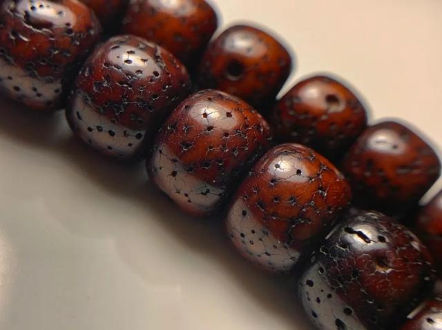 很多新手玩星月总会有各种疑问和困惑,甚至疑神疑鬼的总是怀疑自己是不是上当受骗了,其实星月相较于金、百香籽之类的来说它的料质简单的多,也十分稳定没有那么多问题,它是棕榈科的植物,也就是油脂丰富的树籽皮实耐造,只要你盘玩的时候保持手干净的话,基本上它没有其它顾忌的,今天我们就来盘点一下新手盘玩星月时,容易困惑迷茫的地方。 第一个雕刻的星月珠子,它的星点里容易变空,因为它的星点就是凝固的红色素,和我们画画用的颜料是一样的道理,那个东西它不结实,如果是雕刻的珠子,它的侧面红色素露出的面积就大了,这时候你用手都能给它抠下来,这样星点里就空了,红色素它遇到水能融化,它就和颜料是一样的。 第二个就是星月变色的速度,曾经有位北方的大哥在寒冷的大冬天里买了一条星月,还没有过24小时,他就觉得手里的手串没有变成黄色,就怀疑这个手串有问题,我特别想问什么手串在北方的大冬天里,24小时之内能变成黄,星月的变色就是它表面的油脂氧化变色,在高温下冒油就快,油脂氧化变色也快,所以夏天变色快,在冬天尤其是寒冷干燥的北方的冬天冒油就慢,氧化变色的速度也会特别的慢啊,这个道理是不是太简单了。 第三个就是色差期,有的朋友手串买到手之后盘了没有几天,他就说手串花了说料子有问题,这个原理更简单,就是所有的树籽手串在前期变色的时候都会有色差期,因为每颗珠子它变色的快慢的速度是不一样的,有的珠子它变色快它的颜色就先变深了,有的珠子它变色慢它就显得颜色浅一点,这个时候你看手串你会觉得它有点花,但是到最后颜色肯定都是统一一致的,因为你看到的颜色就是它表面上冒出来的油,那油氧化到最后肯定都是一个色,只是你不能要求每一颗珠,从一开始就以同样的速度去变色那不现实,哪怕你买两个苹果放在那,你看这两个苹果它变色和腐烂的速度也会不一样的,总有一个快一个慢,但到最后肯定都是一样的结局,这都是生活常识但是有的人你跟他再讲也没有用,他就总觉得全世界都要害他。 第四个就是玩手串不要听朋友瞎说,有一个顾客在别人家买了一条星月,盘了一个月没有变色他就去问他的朋友,他的朋友告诉他说这个手串是泡药的,然后他就把照片发给我了,让我来鉴定一下,我一听泡药的我就迷糊了,星月还有泡药的星月泡药它会起到什么作用呢?我一看照片原来这是一串脱脂星月,脱脂星月它盘一个月没变色非常的正常,而且那条手串的品相还是不错的,你就慢慢盘就可以了。