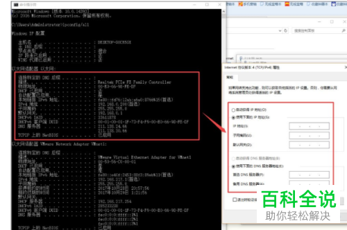 6. 接下来,进入CMD页面,输入ipconfig/all命令,回车,在页面红框中的内容粘贴到“选中internet协议版本4(TCP/IP4)”窗口中。另外,将IP地址的最后一段设置为1-255的任意数字,尽量设置大一些,防止和局域网中的其它用户冲突;