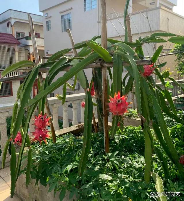 从网上买几棵火龙果的枝条,一根枝条也只不过五六块钱,买上三五根,收到之后直接用土锹在院子的周围,挖上几个土坑,把火龙果的枝条埋到土坑里,浇上一遍水火龙果的枝条就可以发根生长,它的生命力就像是仙人掌一样,种植的成活率能达到90%以上,南方的湿度高,很适合火龙果的生长。