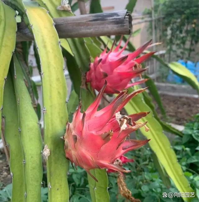 过一段时间的生长,火龙果的枝条就会发根,并且从原本的枝条上会长出新的枝条,新长出来的枝条会不断的蔓延生长,这个时候就需要我们麻烦一些,找几根竹子做好支架,让火龙果的枝条沿着支架进行生长,搭好支架的基础下,后期他自然而然就可以结果子了。