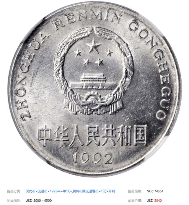 在SBP香港拍卖会上,有一枚1992年的牡丹一元,币面上已经有了不少的划痕,但依然受到了众多藏友的竞拍,最终它拍出了5040美元,差不多就是3600,这种表现在牡丹一元中堪称惊艳,已经称得上是牡丹一元中的币王了。