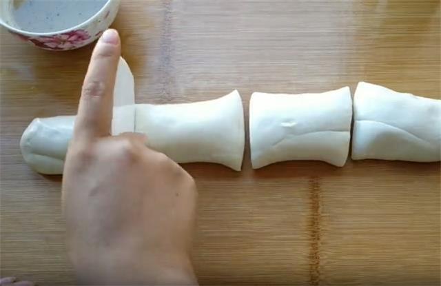 3.大家可以经过一夜醒发的面团,表面会变得异常光滑且富有弹性,无需过多揉搓,直接搓成长条,分割成四等份的面剂子。