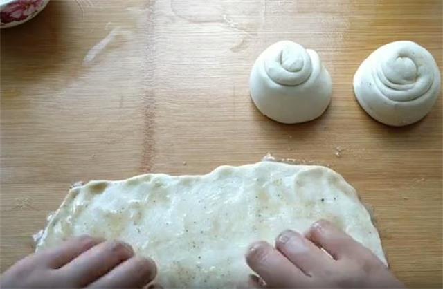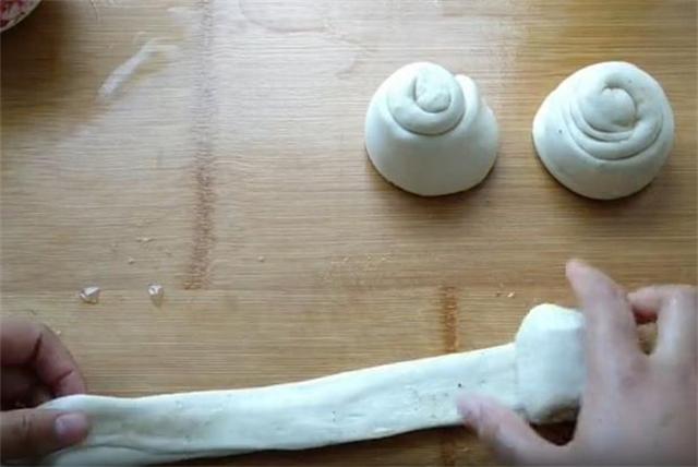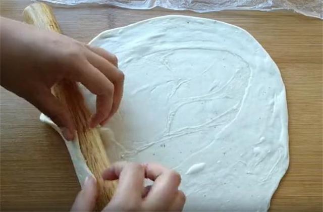4.接下来我们把面剂像这样抻长按扁,再擀成薄片,均匀涂抹上之前准备好的油酥。