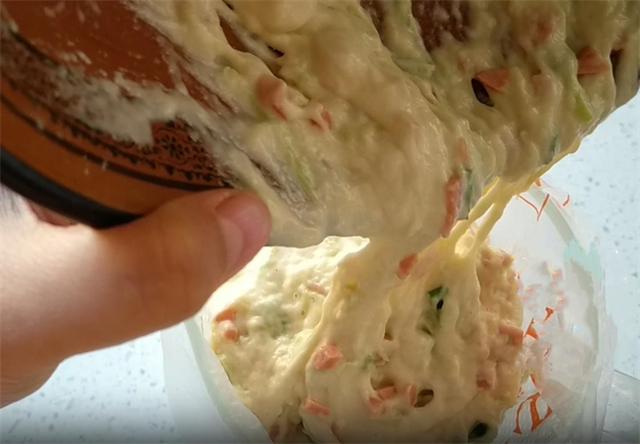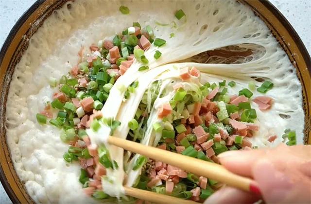 4.这是发酵一晚的面糊,大家可以看到因长时间的发酵而略显塌陷,并带有一丝自然的酸味,我们加入一克小苏打中和酸味,接着,将处理好的萝卜丝、葱花与素火腿丁一并加入,再加入适量盐与味精调味。