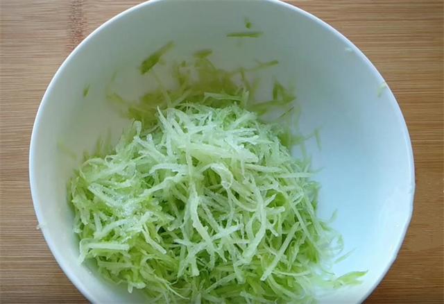 2.早起的时候,我们把萝卜洗净去皮后擦细丝,撒上适量的盐,静待片刻,让萝卜丝自然析出多余水分,萝卜丝不要直接放入面糊中,因为水分含量比较多会影响发酵,影响面饼的蓬松口感,甚至不会起发。