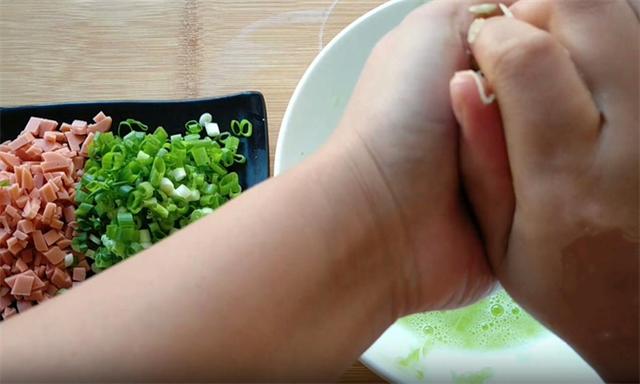 3.在腌制萝卜丝的期间,我们切些葱花与素火腿丁,既增添了色彩,也丰富了口感层次,然后把萝卜丝攥干备用。