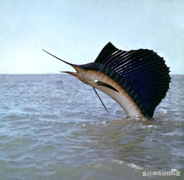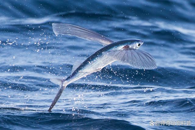 旗鱼是海洋中速度最快的鱼类,它属于鲭亚目旗鱼科,又被称为芭蕉鱼。这种鱼主要生活在太平洋的热带和亚热带大洋区域,被公认为游泳速度最快的短距离内游鱼类之一。旗鱼具有前颌骨和鼻骨向前延伸形成的尖长喙状吻部,看起来就像一把宝剑。它们的身体呈青褐色,并有灰白色的圆斑点。旗鱼的第一背鳍长而高,上面有黑色斑点,犹如随风展开的旗子,因此得名旗鱼。据吉尼斯世界纪录记载,旗鱼被认为是海洋动物中速度最快的物种,其最快时速可达190公里/小时。 2、世界海洋飞得最远的鱼(飞鱼)