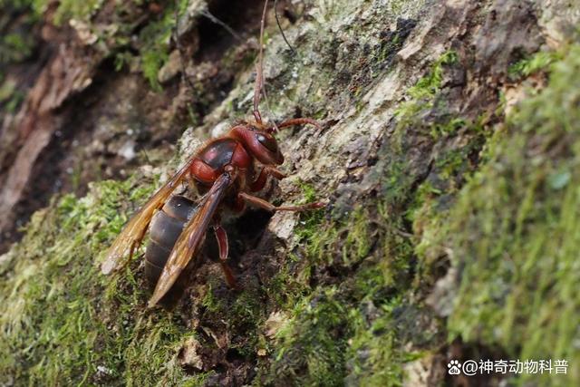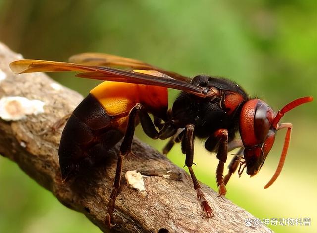 7、金环胡蜂 金环胡蜂(学名:Vespa mandarinia)是一种大型的胡蜂,也被称为亚洲巨大黄蜂、亚洲**蜂等。它们是世界上最大的黄蜂之一,体长可达5厘米以上,翅展可以达到7厘米。金环胡蜂主要分布在东亚地区,如中国、朝鲜、日本等地。它们常常筑巢于树枝、土坑或洞穴中,并形成庞大的社会群体。这些社会群体由一只雌性“王后”和许多工蜂组成,工蜂负责寻找食物和维护巢穴。金环胡蜂对人类造成的威胁比较大,特别是当它们感到自己的领域受到威胁时,会攻击任何靠近巢穴的生物,包括人类。其毒液含有强烈的神经毒素,能够导致剧烈的疼痛、呼吸困难甚至死亡。因此,如果发现了金环胡蜂的巢穴,应该尽早通知专业的灭蜂队伍进行清除。