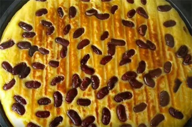 4.这时我们起锅开小火,油温微热倒入面糊摊平,摊面糊的时候你可以先关火,这样防止底面加热,上面没有加热烙的不均匀,摊平之后撒上一些豆子或者是黑芝麻干果,自己喜欢的即可,淋上油,盖上盖子焖一分钟,开盖之后,我们利用一个盘子翻面,然后再盖上盖子焖一分钟,开盖之后,用铲子按压立即回弹即可出锅。