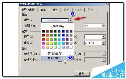 5、在“填充颜色”这里,点下小三角,弹出的菜单中选择“填充效果”;